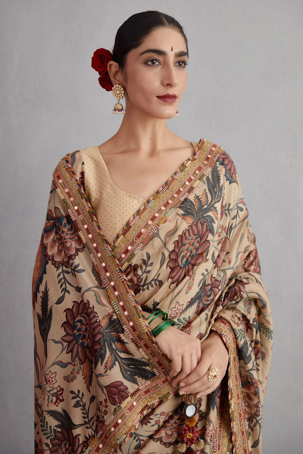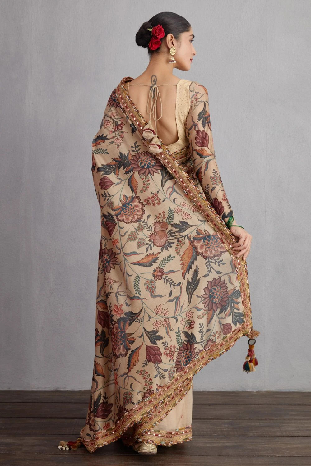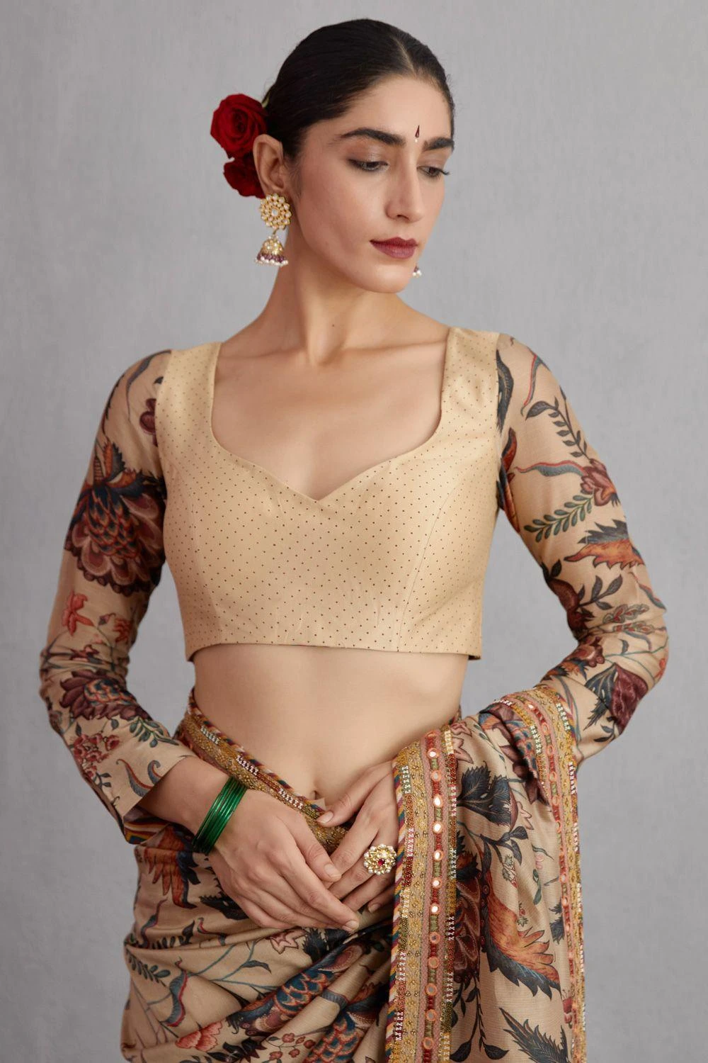 This elegant chandan revathi blouse will perfectly complement your saris. It is cut in handwoven chanderi & cotton silk fabric and features a gentle sweetheart neckline. You can team it up with a coordinating sari for an elegant look.