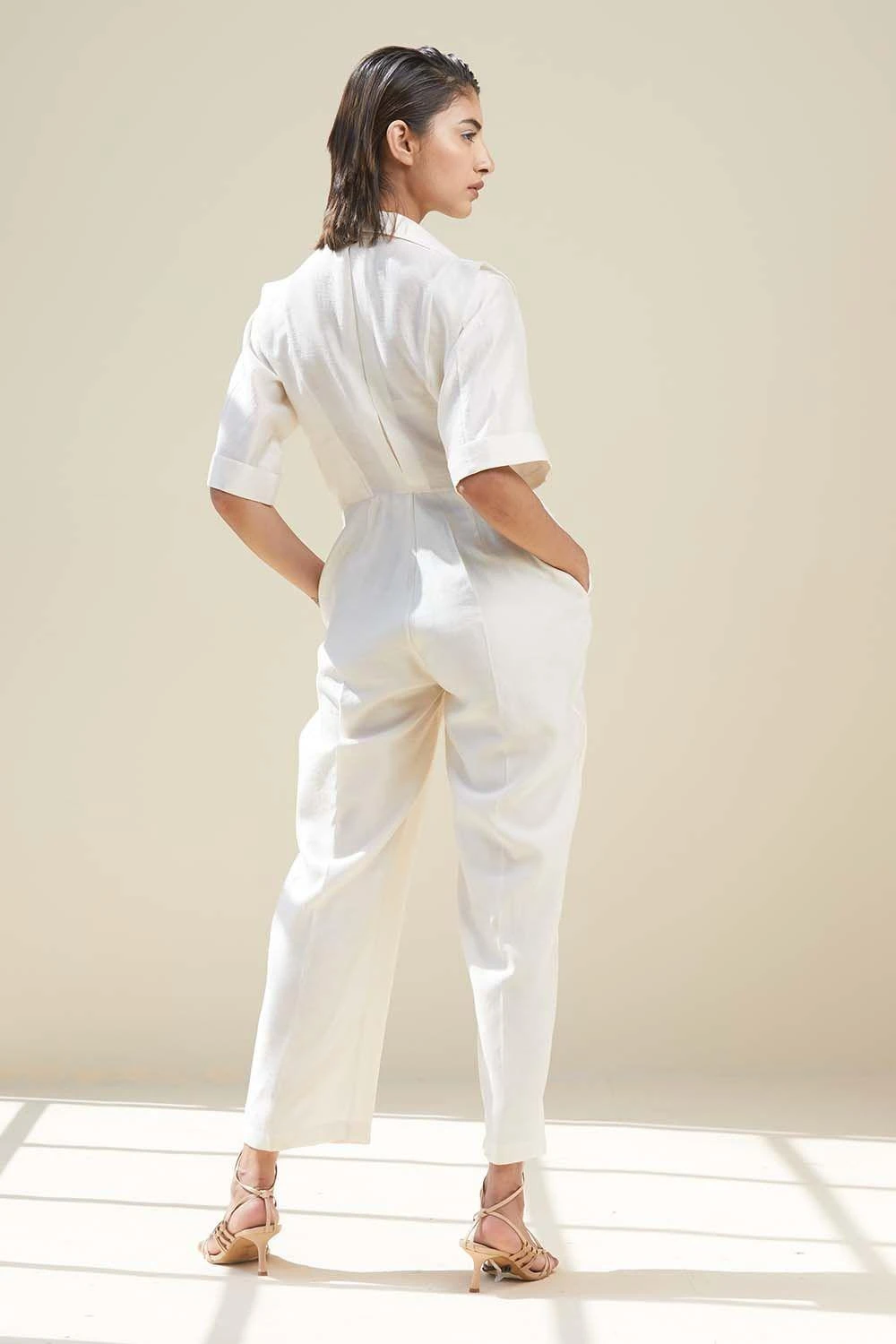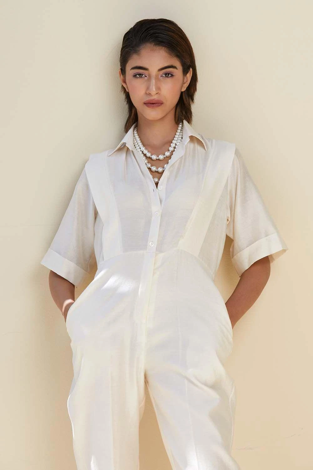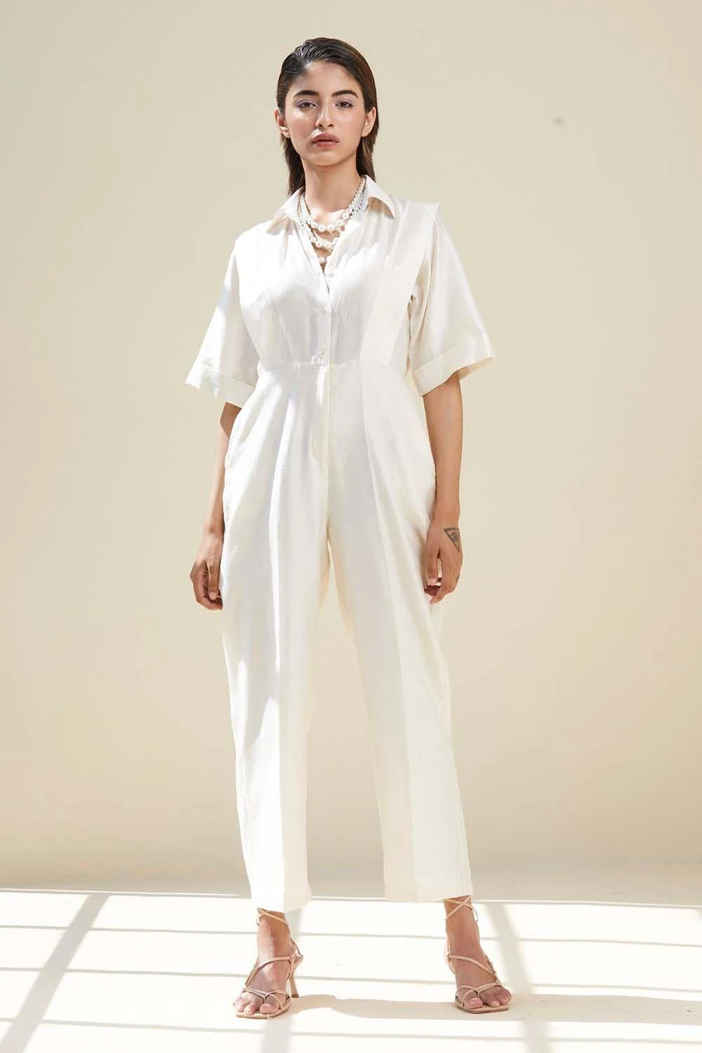 This stylish handloom chanderi ivory jumpsuit is chic & functional. The clean silhouette & calming colour make this a great summer – spring outfit. Style is with statement earrings & bag a to complete the look.
