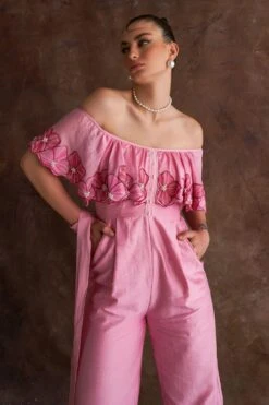 The corset bodice boasts resham embroidery adorned with sequins, bugle beads, and colorful drops for a glamorous touch. Paired with a net cape featuring a draped floral detail, it’s a captivating ensemble.