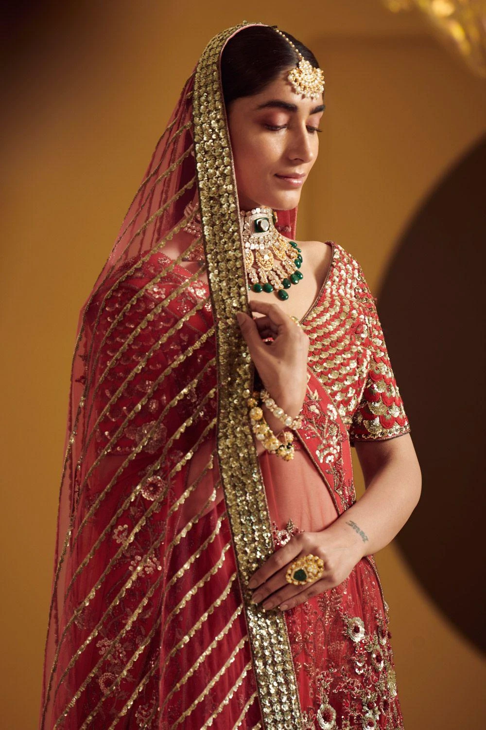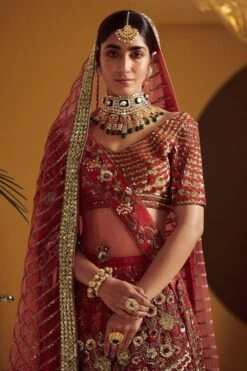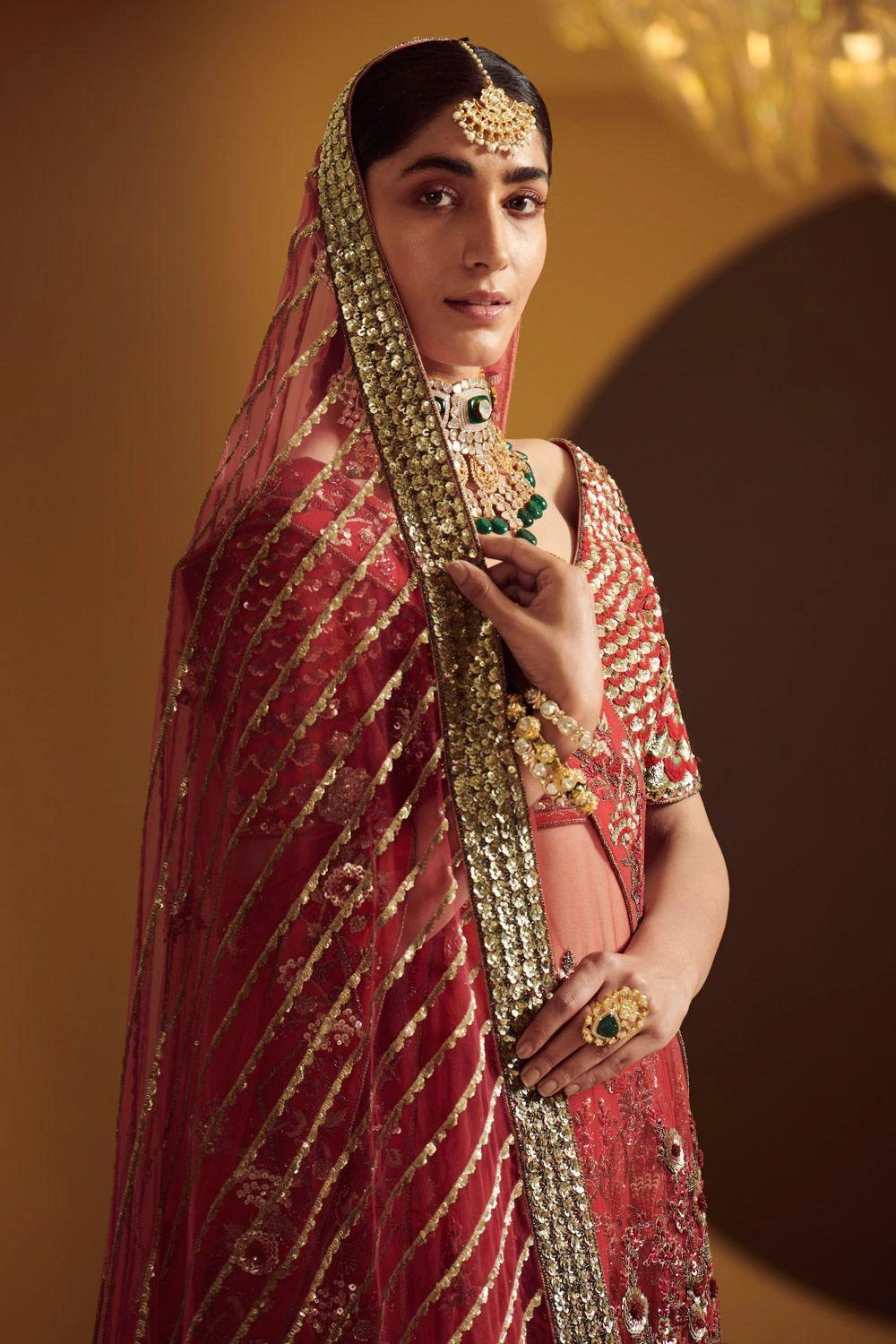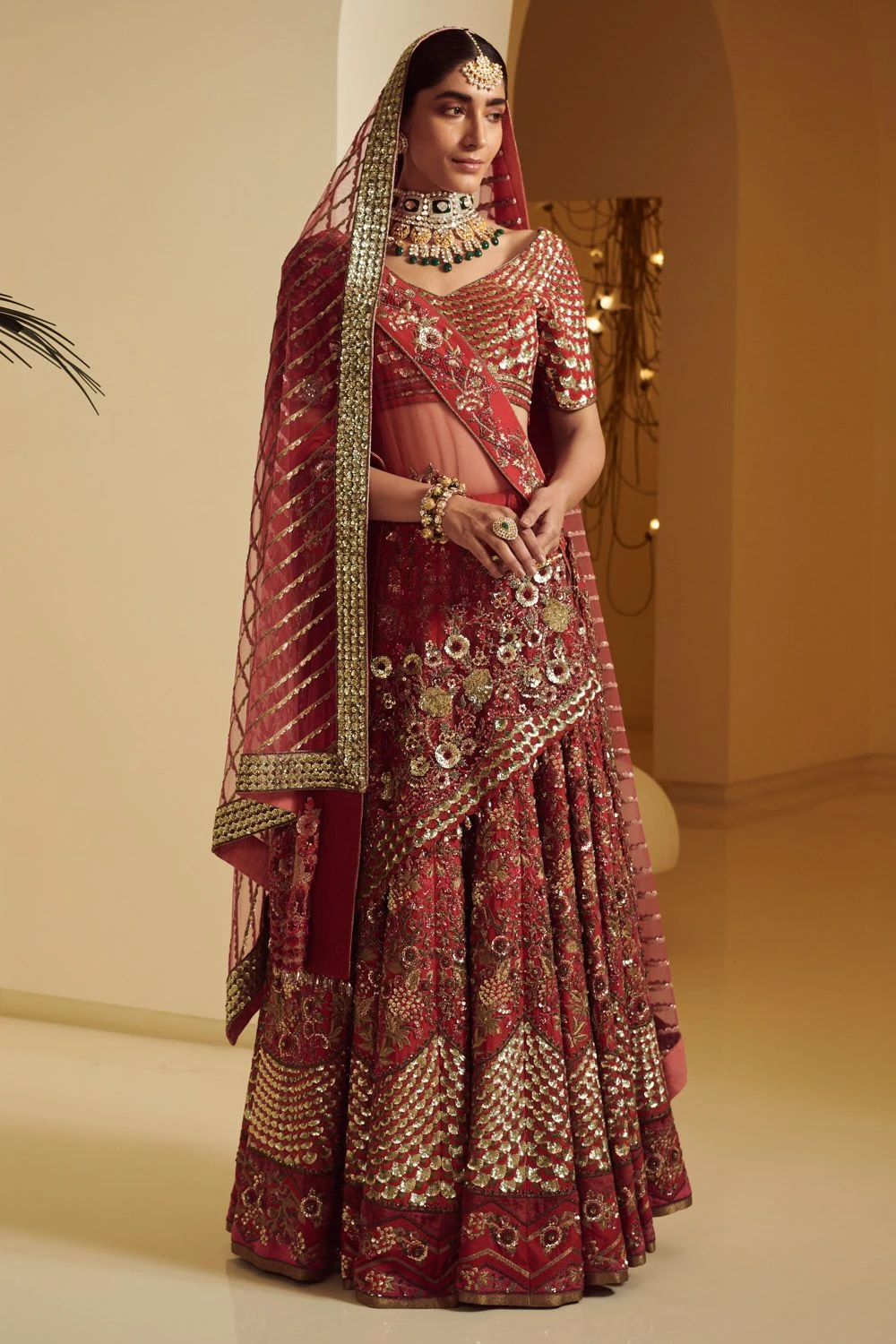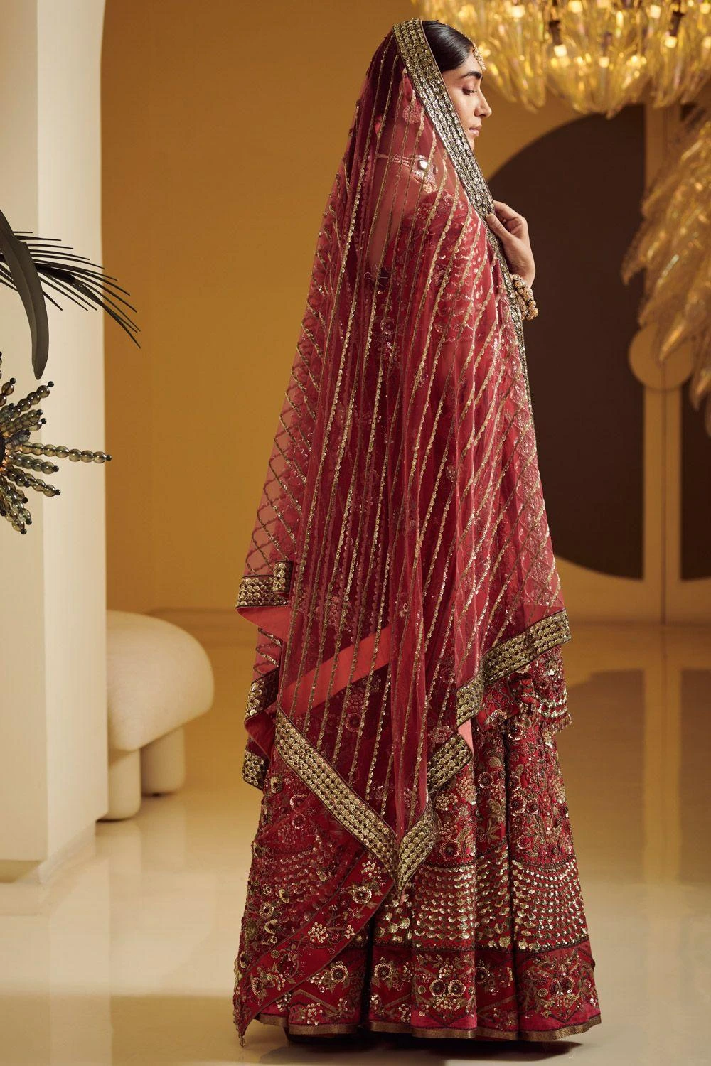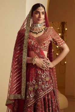 This regal maroon lehenga set is perfect for your big day. This timeless piece is adorned with resham thread embroidey & embellished wuth pearl, sequins & cutdana details. This elegant set is perfect for winter weddings.