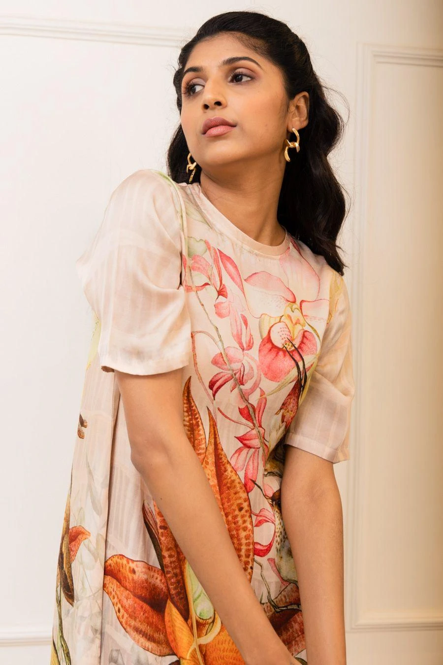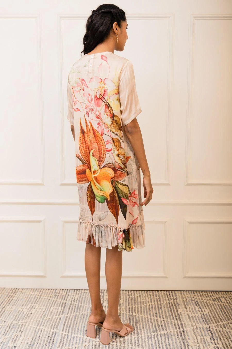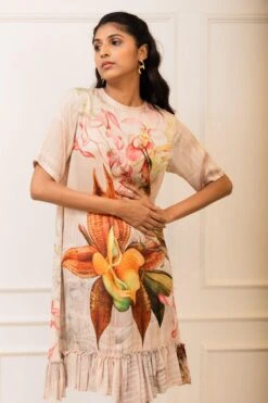 Add a layer of style & glamour to your resort getaways with this dress. Crafted in modal satin, this dress features a floral print with ruffle details at the bottom. Style it with a pair of dangler earrings to complete the look.