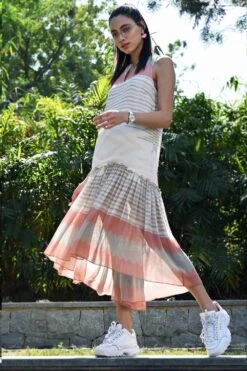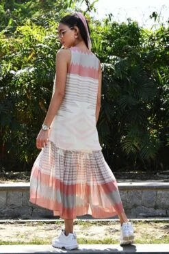 This whimsy dress is a perfect pick for your weekend getaways. It is cut in fluid & flowy printed georgette and features a halter neck and low waist tier detailing. Style it with stacked barcelets for a chic look.