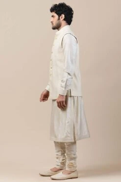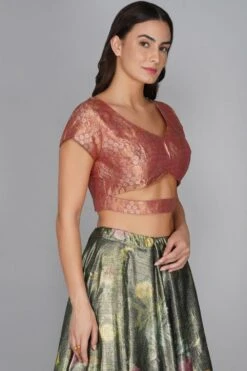 This floral coral blouse is made in luxe brocade fabric and designed in a feminine silhouette with a cut-out detail on the midriff. The brocade base is decorated with intricate zari designs.