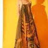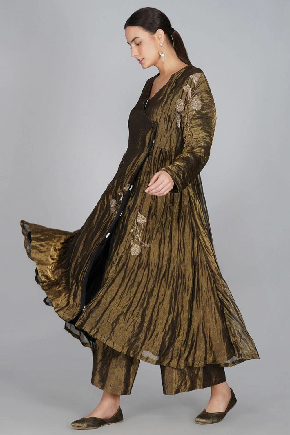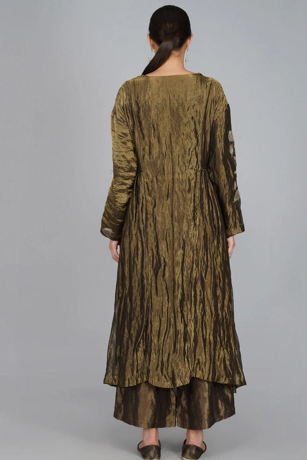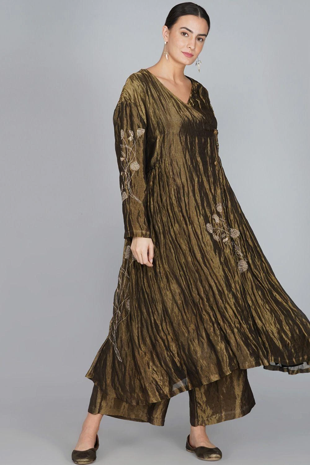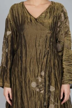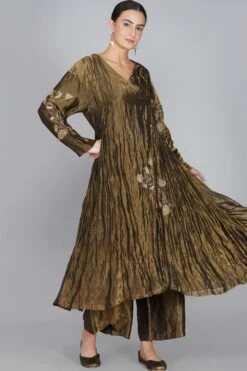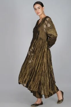 Yavi curates this modern festive dress in rich textiles for this festive season. It is made in gold silk tissue and put together with intricate adda work with finely woven zari. This exquisite silhouette is inspired from traditional Persian angrakha.